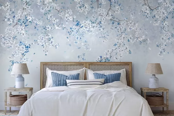 Fotomurales Ramas con flores blancas y azules sobre un fondo fresco. Nr. w05129v2
