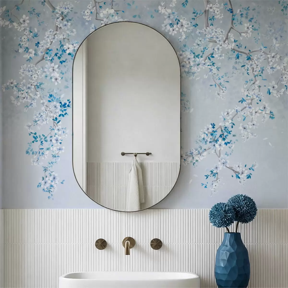 Fotomurales Ramas con flores blancas y azules sobre un fondo fresco. Nr. w05129v2