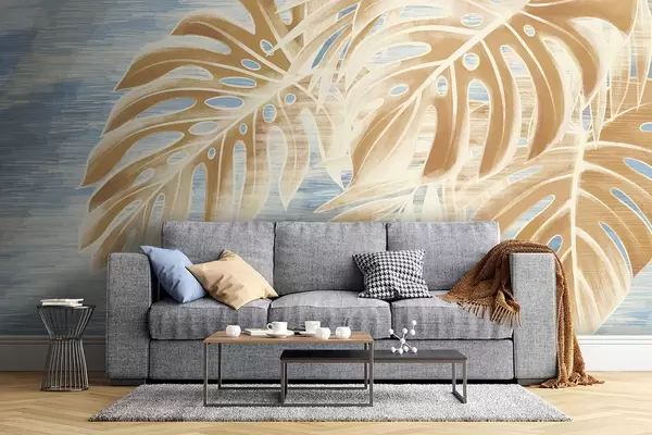 Fotomurales Hojas en tonos arena claros sobre fondo azul. Nr. w05130v1