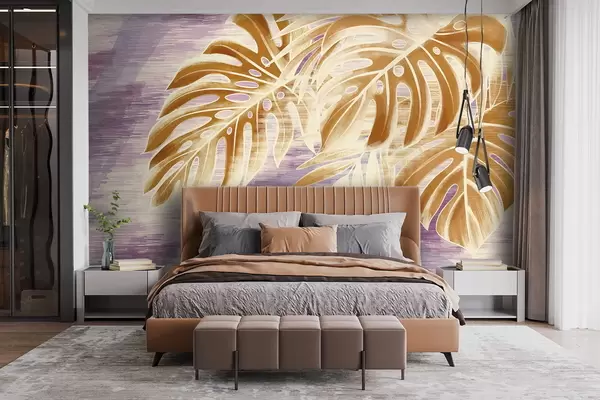 Fotomurales Hojas en cálidos tonos naranjas sobre fondo morado. Nr. w05130v2