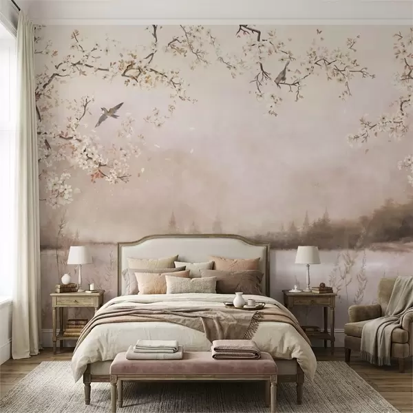 Fotomurales Ramas en flor sobre un lago tranquilo con pájaros en la niebla. Nr. w05155v1