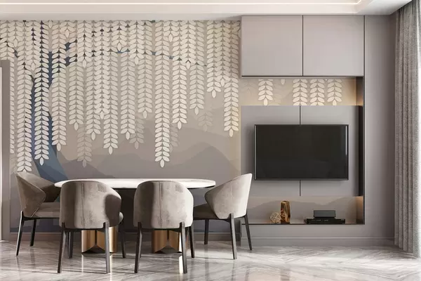Fotomurales Sauce estilizado con hojas colgantes sobre un fondo de montañas minimalistas en tonos beige y azul verdoso. Nr. w05232