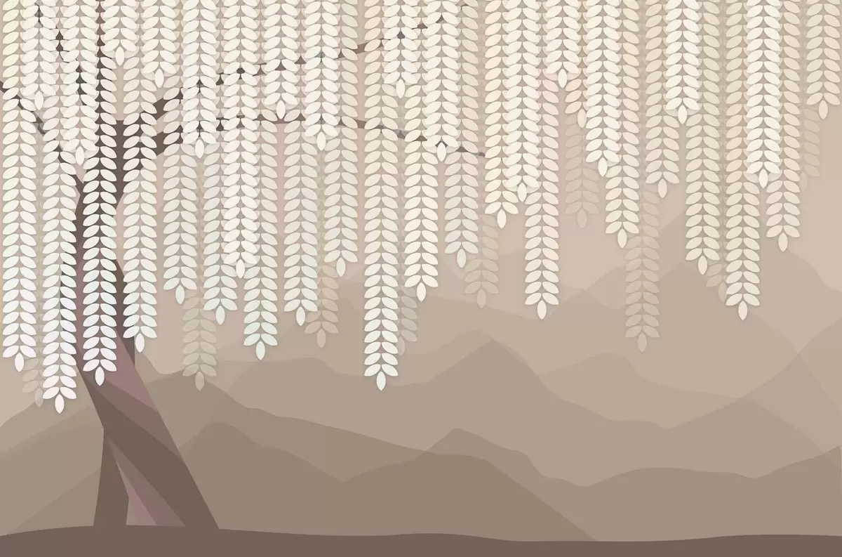 Fotomurales Sauce estilizado con hojas colgantes sobre un fondo de montañas minimalistas en tonos café. Nr. w05232v2