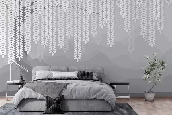 Fotomurales Sauce estilizado con hojas colgantes sobre un fondo de montañas minimalistas en tonos grises. Nr. w05232v3