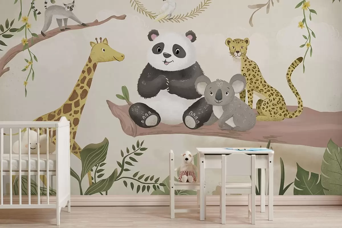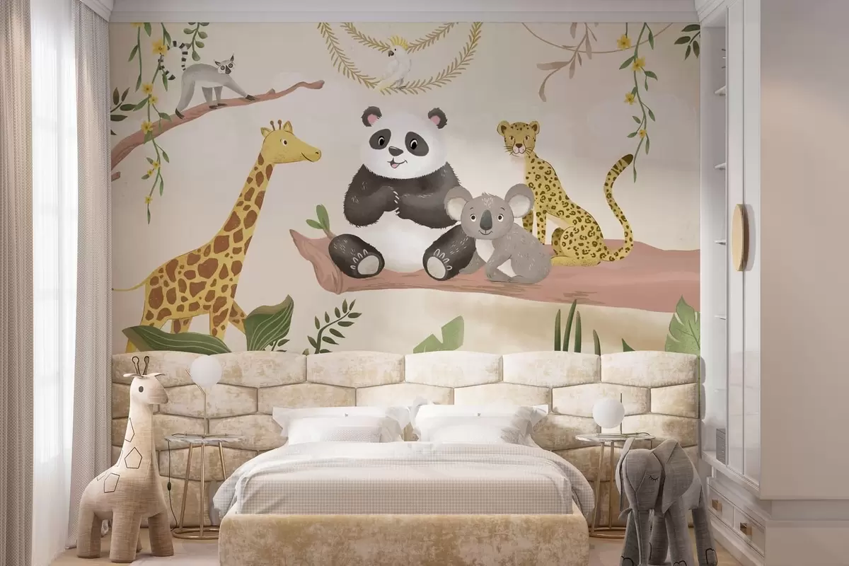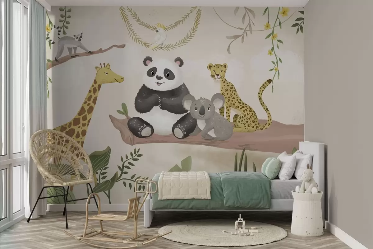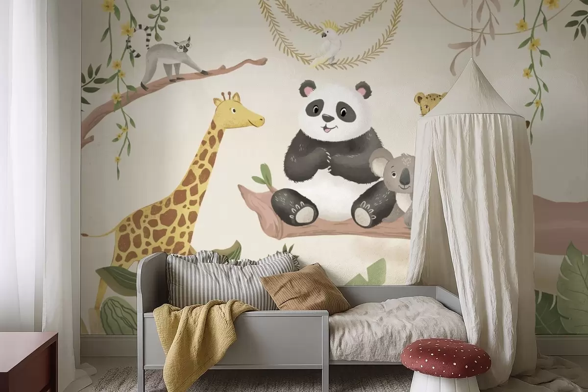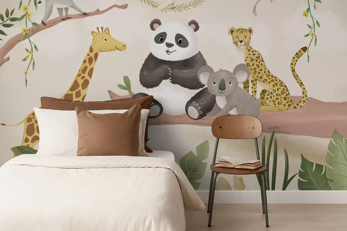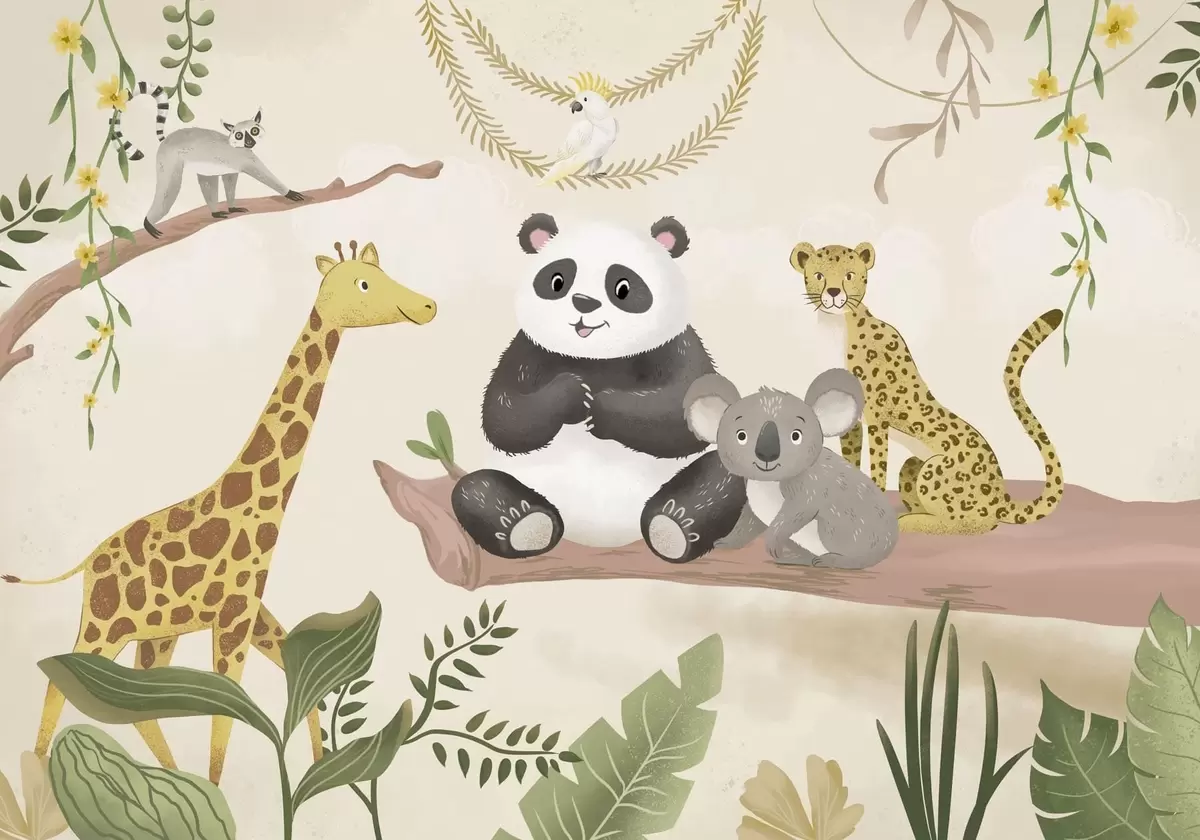 Fotomurales Simpáticos animales de la selva en una rama entre las plantas Nr. w05393