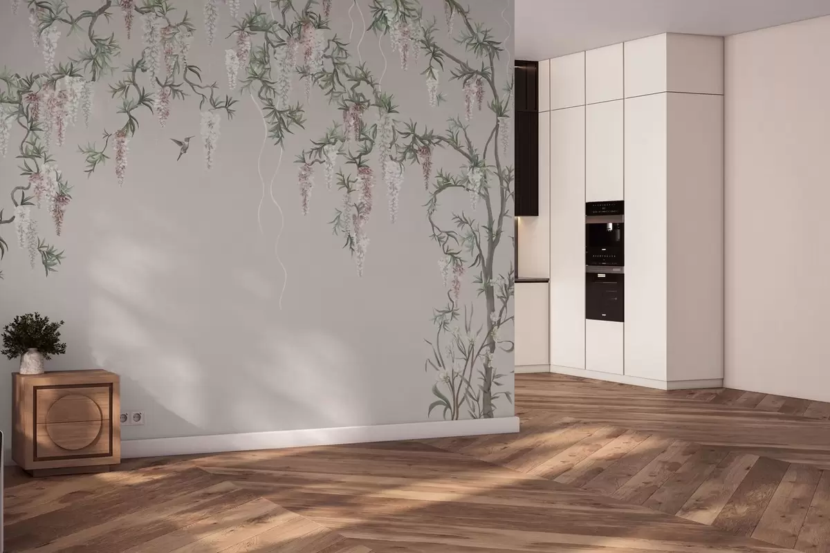 Fotomurales Ramas en flor con capullos rosas y pájaros Nr. w05394v1