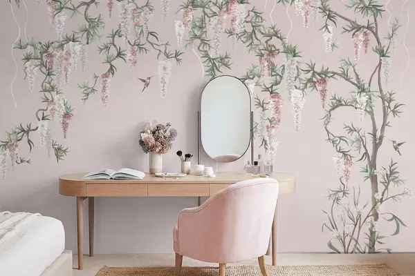 Fotomurales Ramas en flor con capullos rosas y pájaros Nr. w05394v1