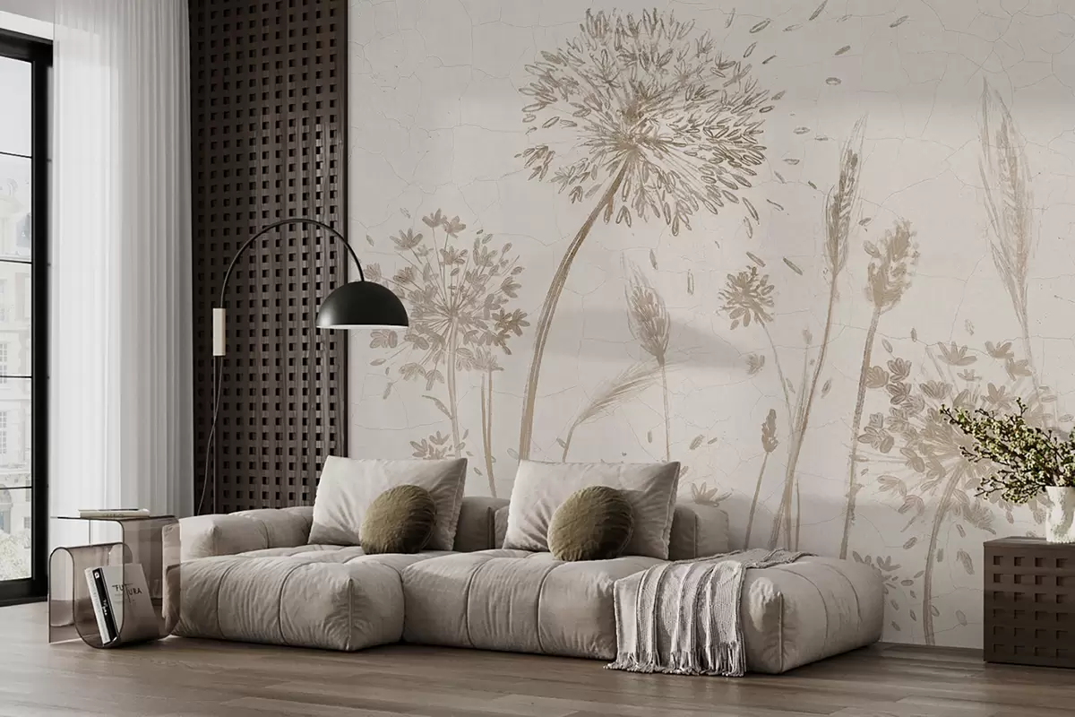 Fotomurales Un campo de dientes de león y otras flores silvestres sobre un fondo suave y brumoso Nr. w07921