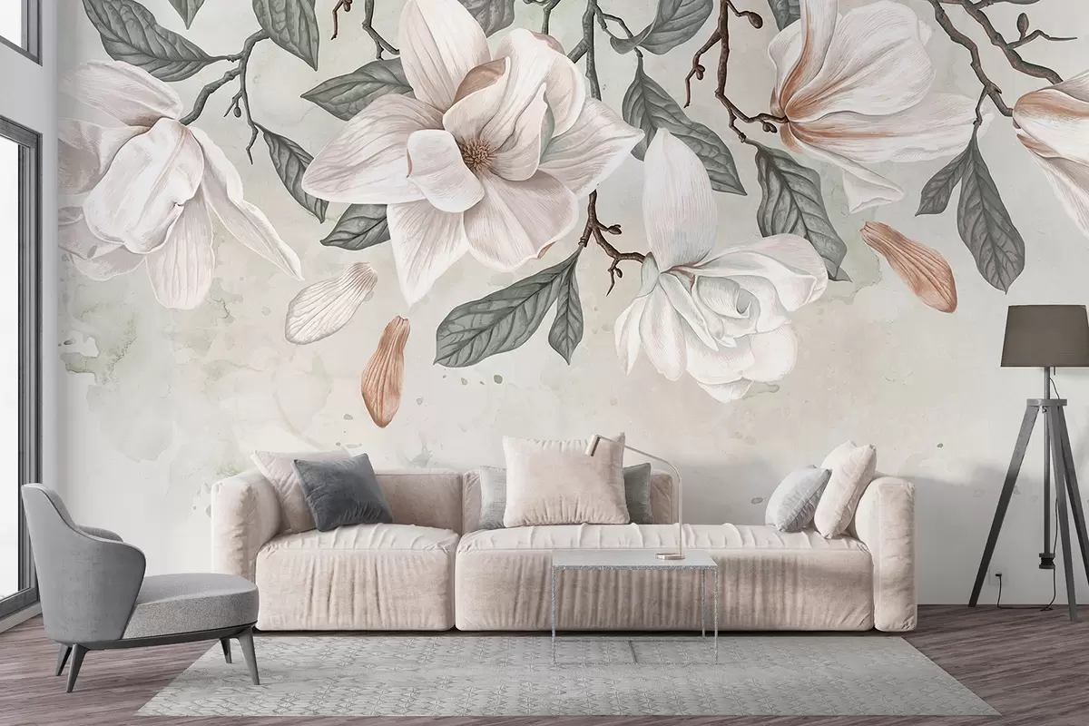 Fotomurales Delicadas flores de magnolia rosa y blanca con hojas verdes sobre un fondo claro, una composición floral suave Nr. w07977