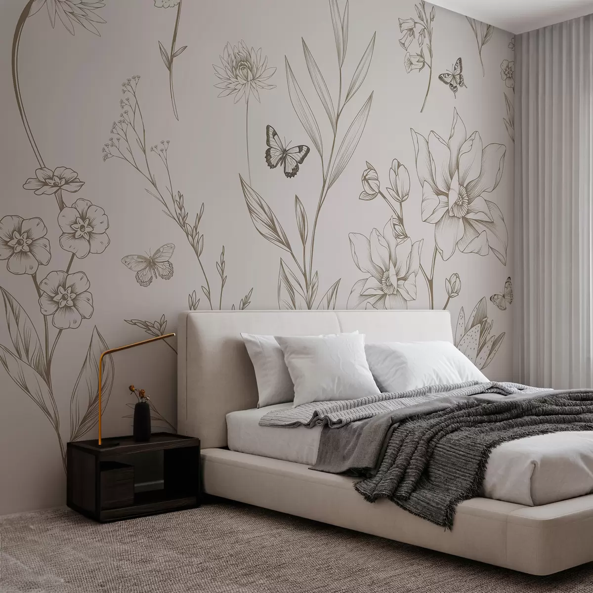 Fotomurales Boho Monocromo Flores y Mariposas en color beige Nr. w08088v1