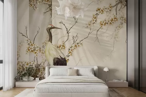 Fotomurales Una grulla blanca parada sobre una rama con flores florecientes, contra un fondo suave y borroso Nr. w08159
