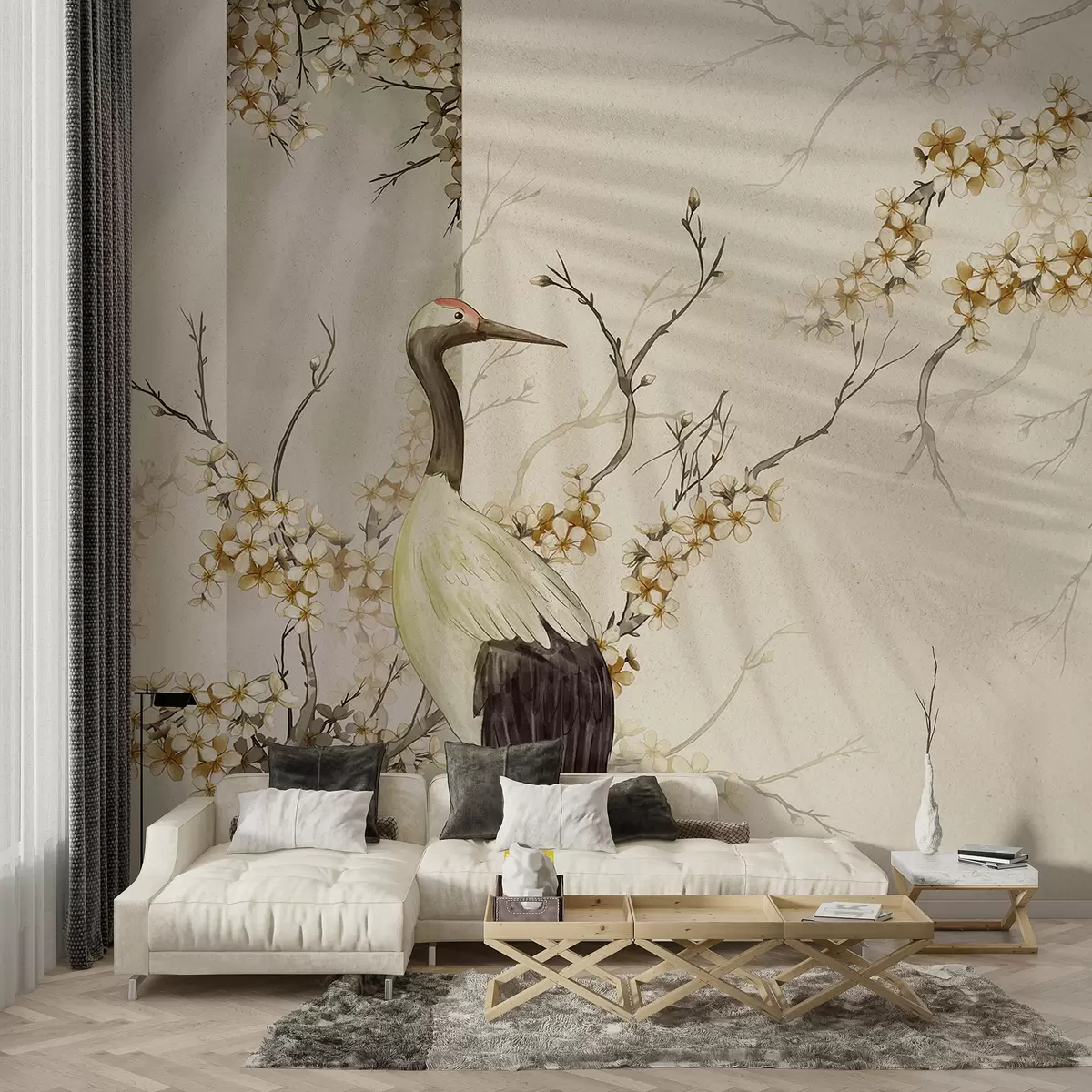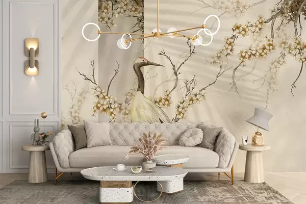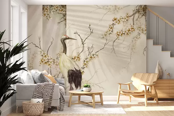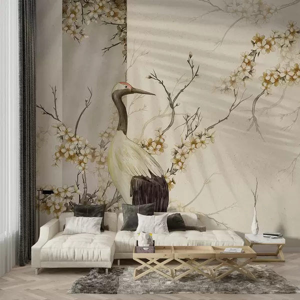 Fotomurales Una grulla blanca parada sobre una rama con flores florecientes, contra un fondo suave y borroso Nr. w08159
