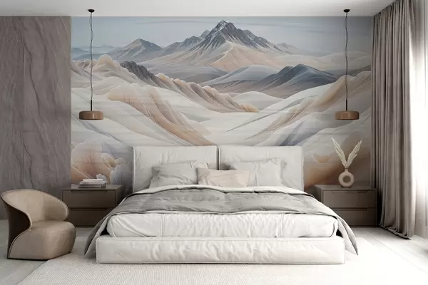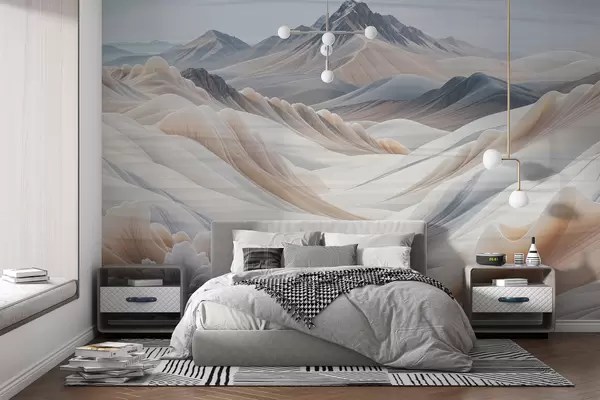Fotomurales Impresión de paisaje montañoso con picos nevados en tonos beige de estética minimalista. Nr. w08191
