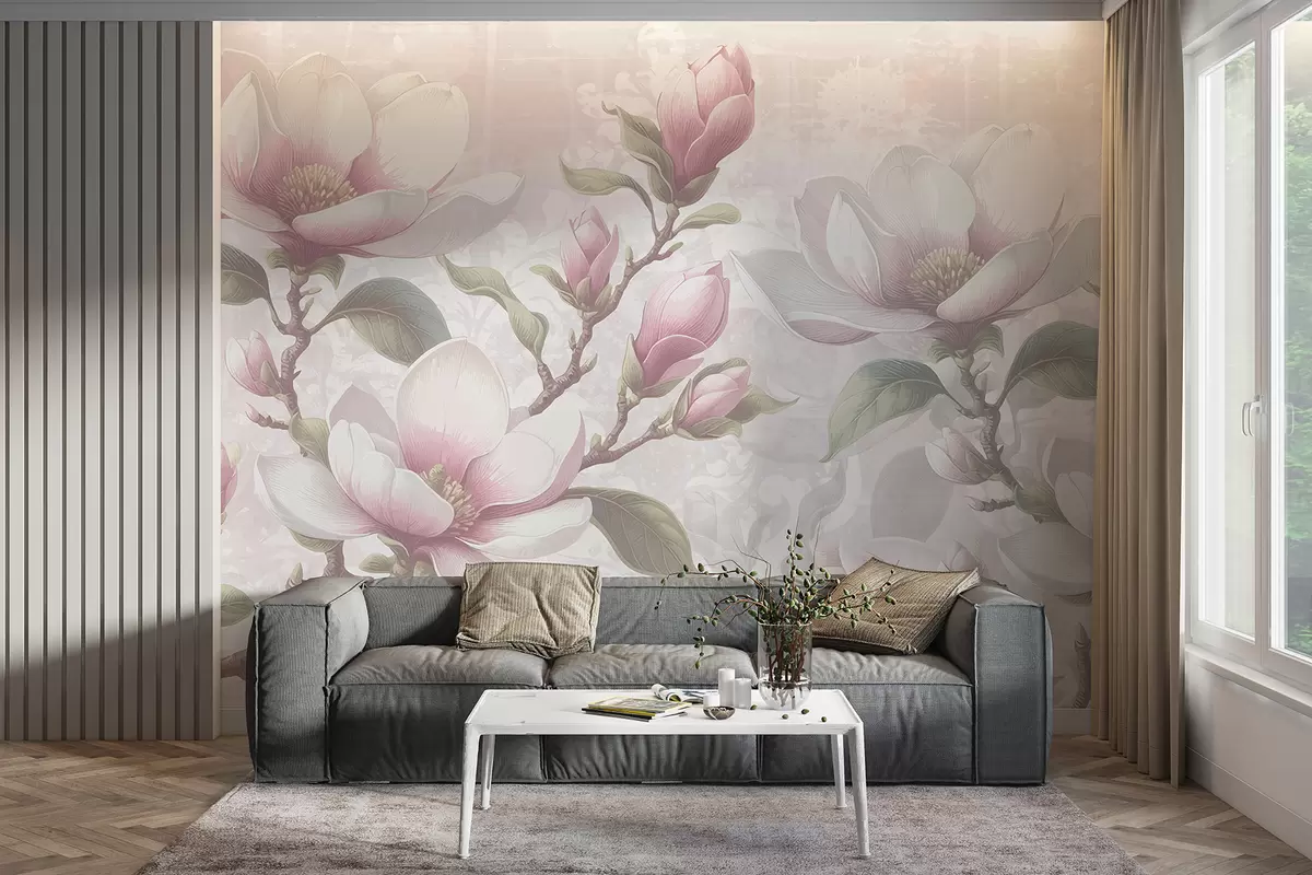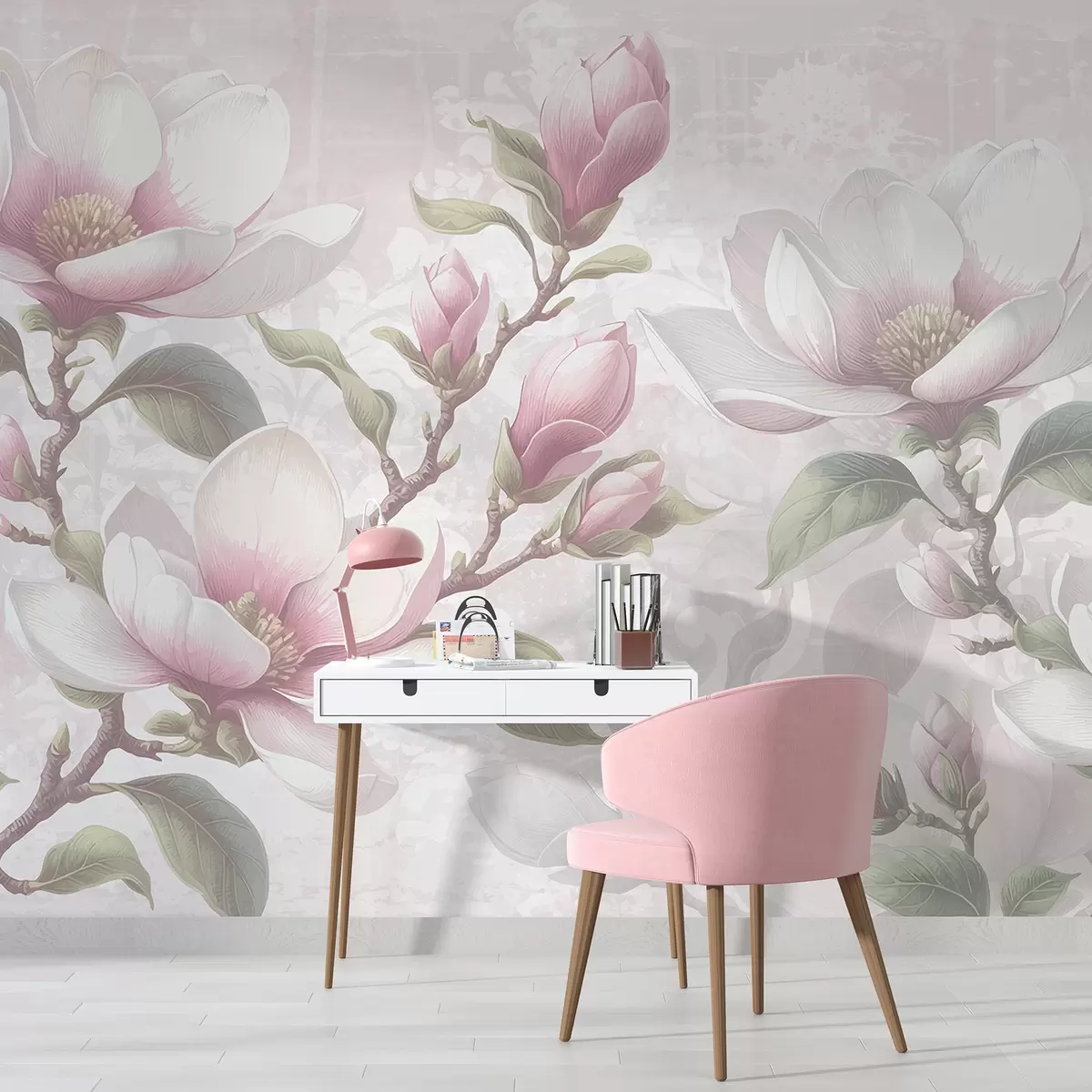 Fotomurales Delicadas flores de magnolia rosa en plena floración sobre un fondo suave y borroso. Nr. w08216
