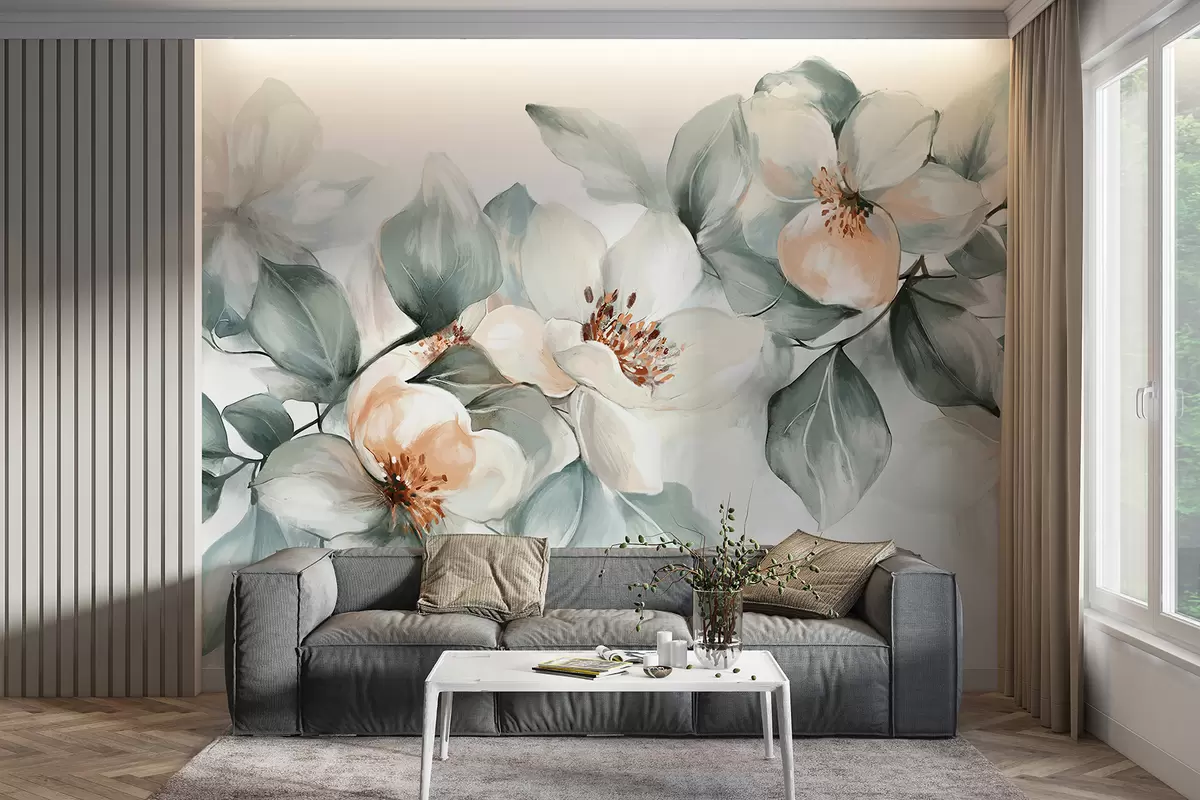 Fotomurales Delicadas flores de magnolia blancas y rosas con hojas verdes suaves sobre un fondo claro. Nr. w08220