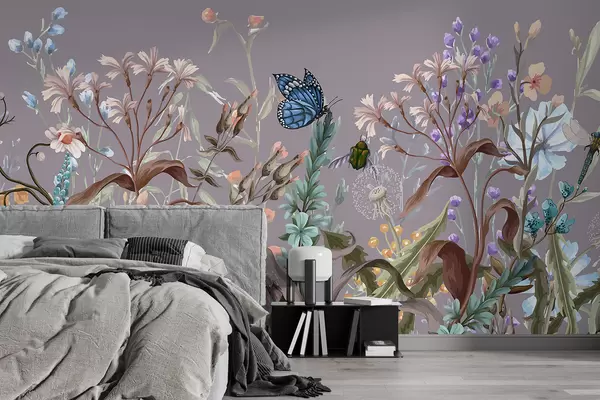 Fotomurales Una colorida ilustración violeta de una escena de jardín exuberante y florido con insectos en un estilo fantástico y onírico Nr. w08234v1