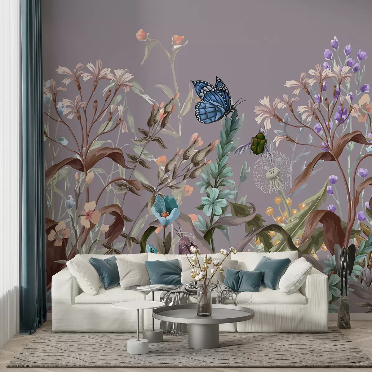 Fotomurales Una colorida ilustración violeta de una escena de jardín exuberante y florido con insectos en un estilo fantástico y onírico Nr. w08234v1