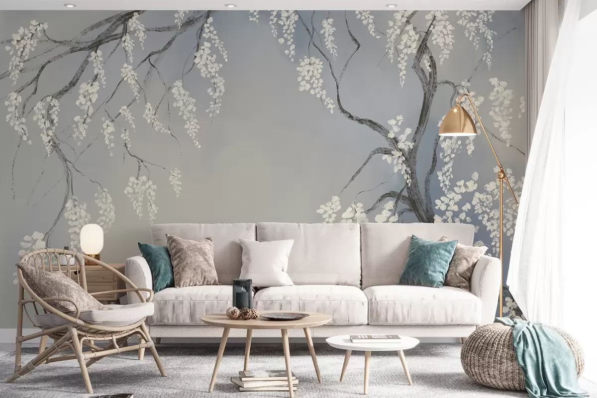 Fotomurales Delicado cerezo blanco con flores floreciendo en las ramas sobre fondo azul Nr. w08243v1