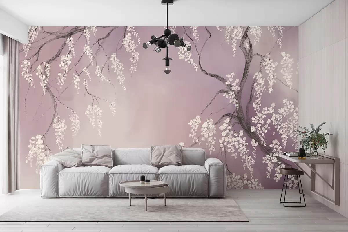 Fotomurales Delicado cerezo blanco con flores floreciendo en las ramas sobre un fondo rosa Nr. w08243v2
