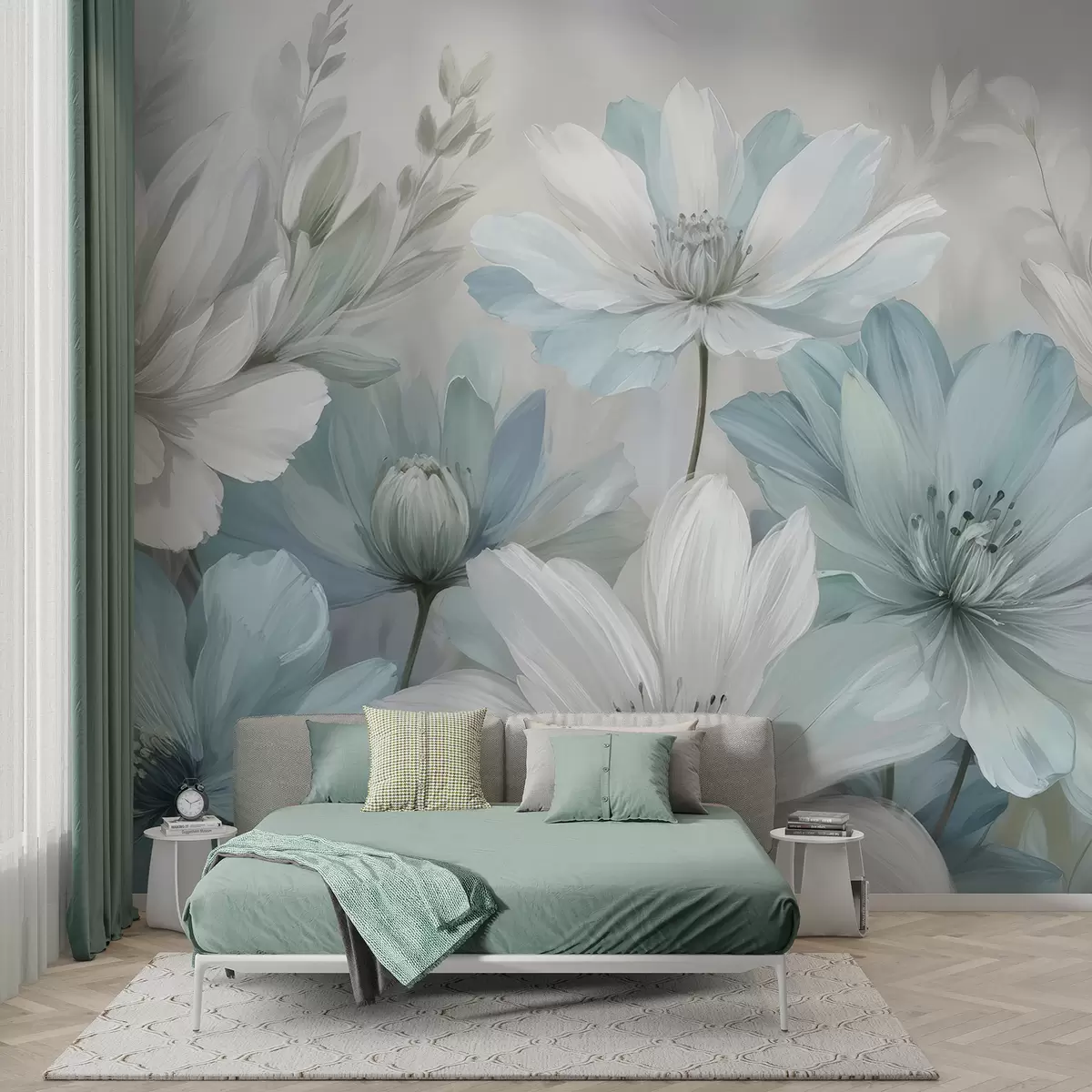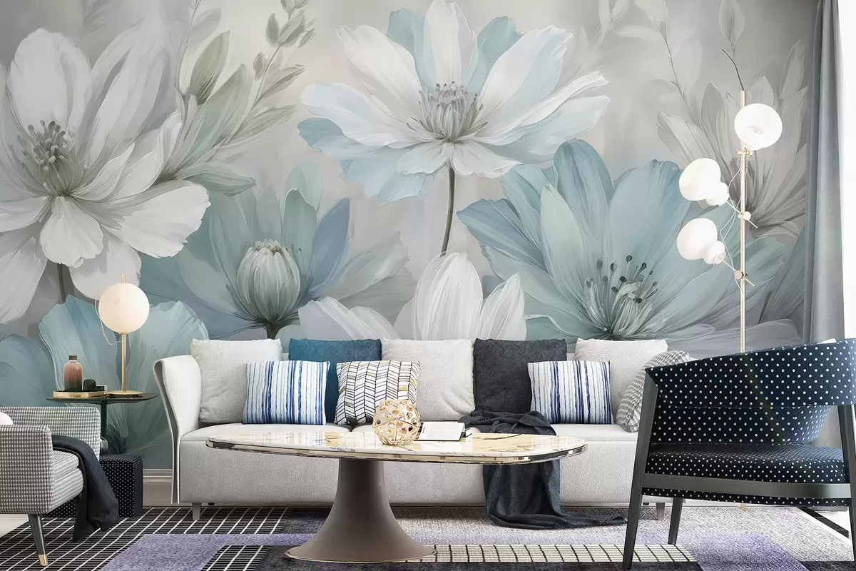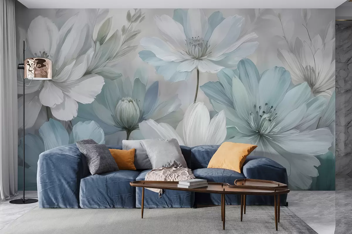 Fotomurales Un primer plano de una pintura artística de flores blancas y celestes parecidas a margaritas con fondos suaves y borrosos Nr. w08247
