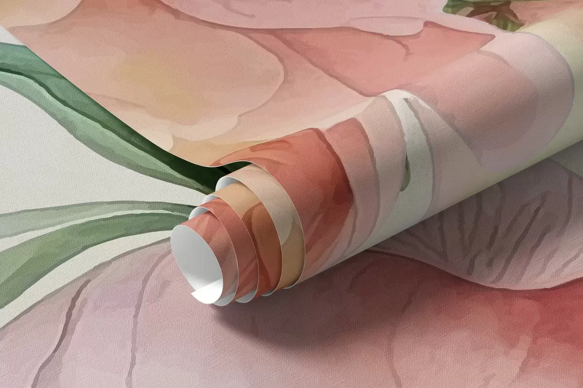 Fotomurales Delicadas peonías rosas y blancas con exuberantes hojas verdes sobre un fondo de acuarela claro. Nr. w08248