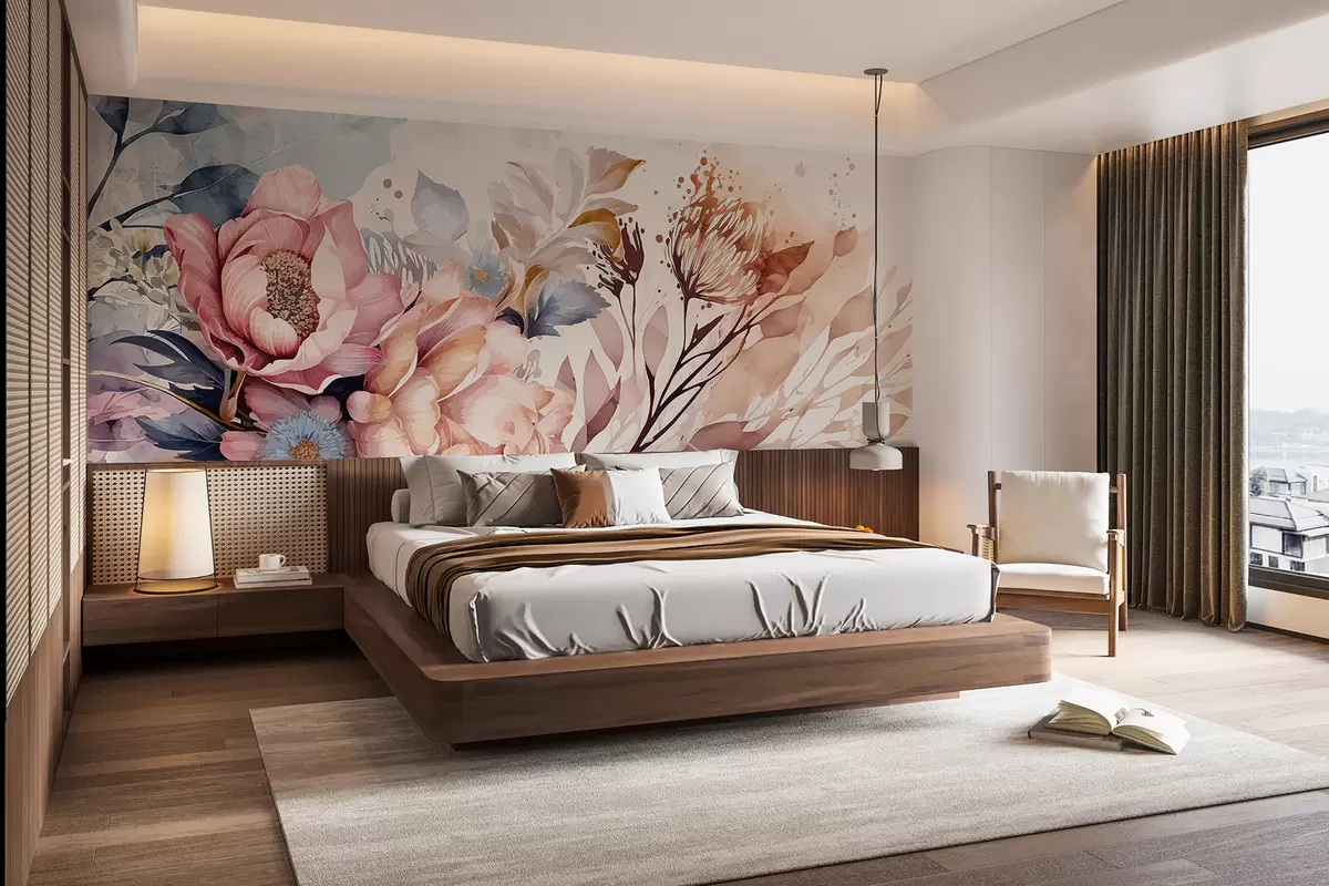 Fotomurales Grandes flores rosas y azules con delicados pétalos, rodeadas de flores más pequeñas sobre un fondo de acuarela Nr. w08256
