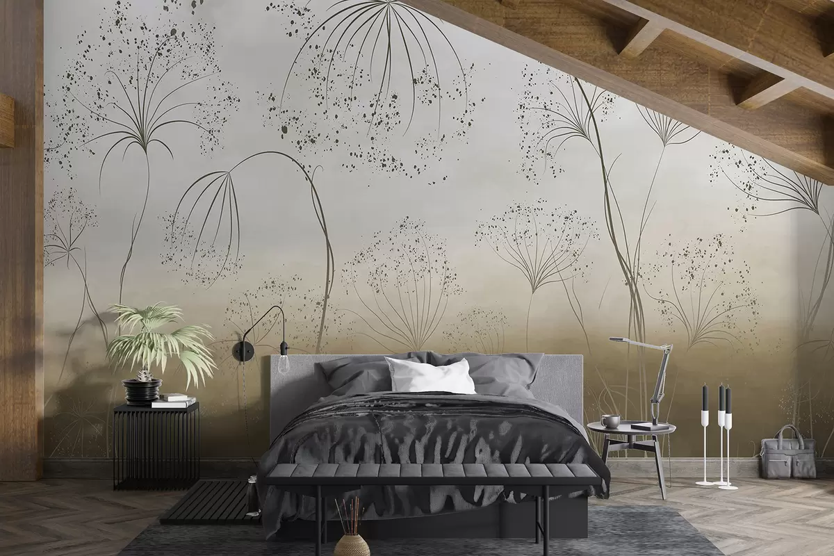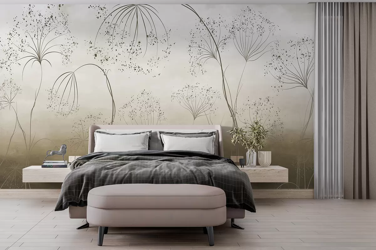 Fotomurales Plantas marrones, altas y tenues, con delicadas flores en forma de paraguas o cabezas de semillas en un entorno atmosférico y brumoso Nr. w08258