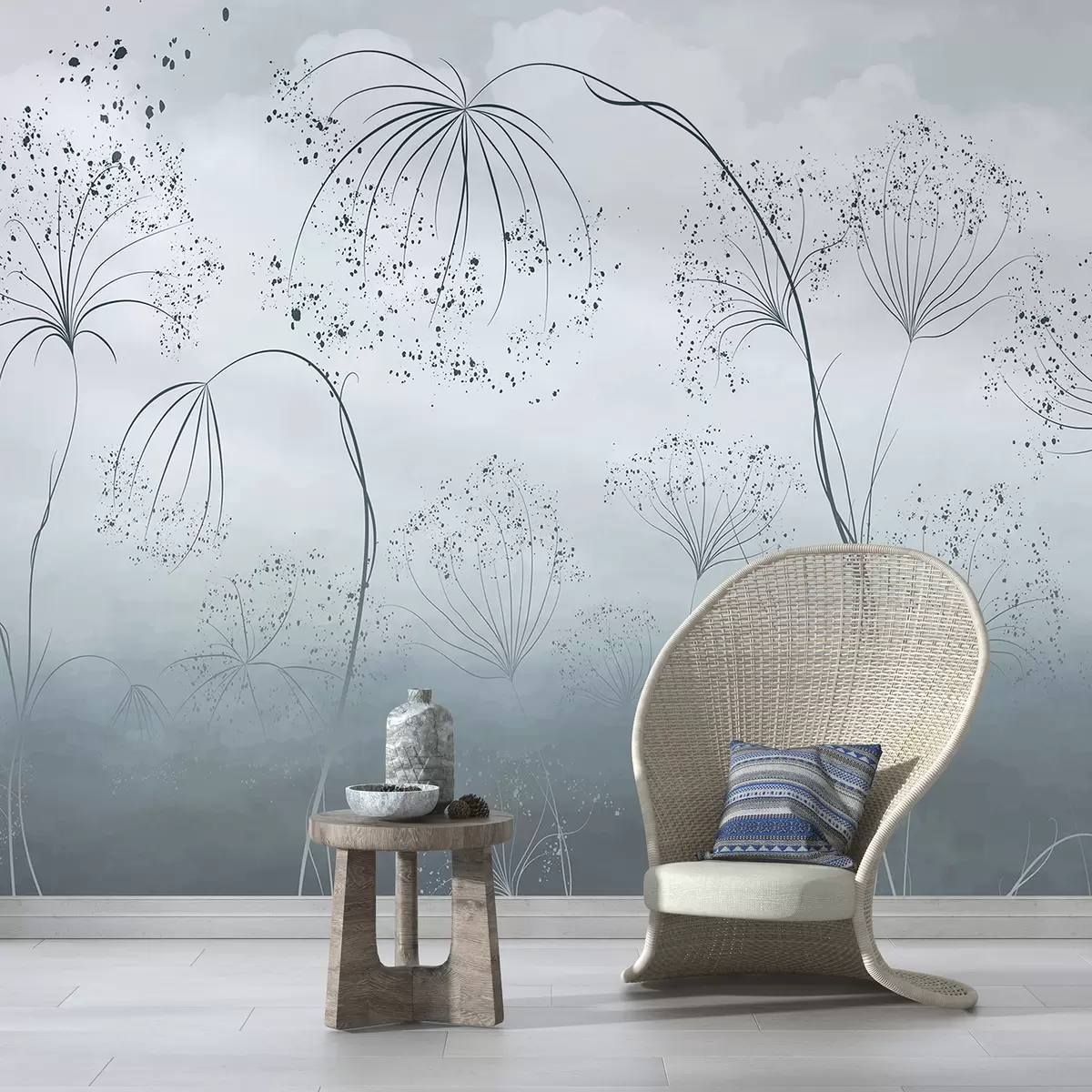 Fotomurales Plantas azules, altas y tenues, con delicadas flores en forma de paraguas o cabezas de semillas en un entorno neblinoso y atmosférico Nr. w08258v1