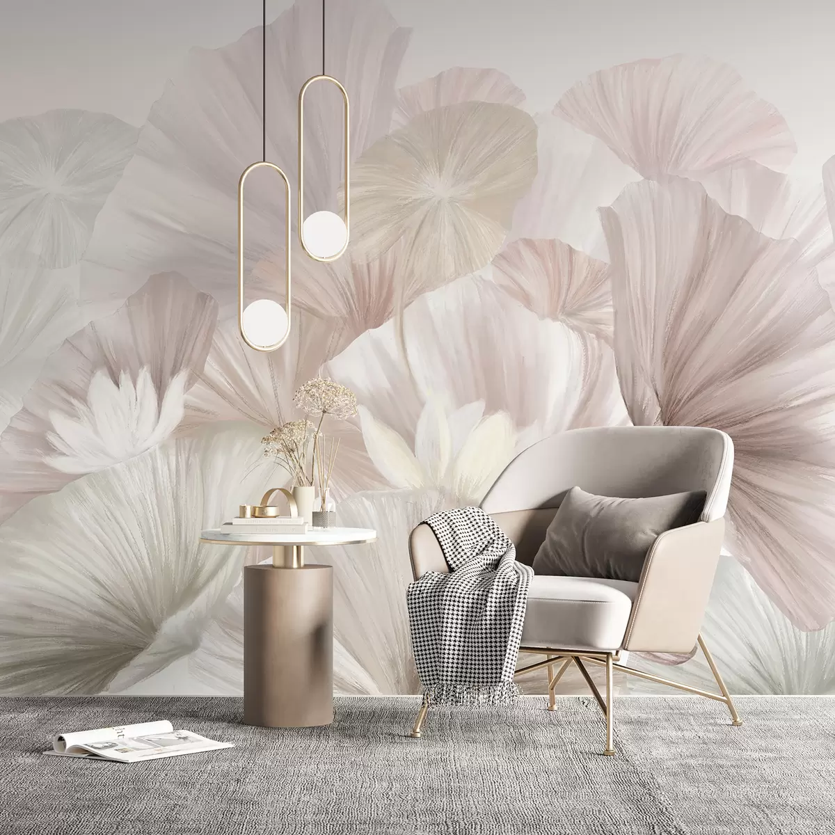 Fotomurales Delicadas hojas de loto rosa con flores blancas de pétalos suaves y plumosos dispuestas en una composición artística natural Nr. w08265v1
