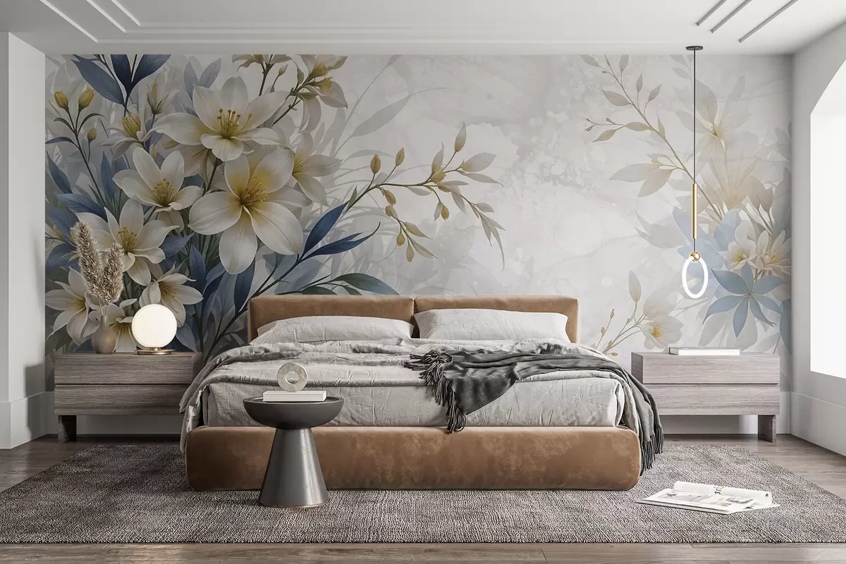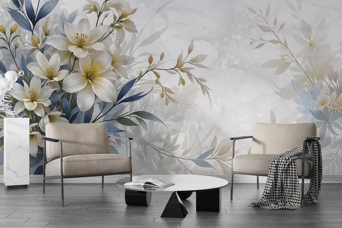Fotomurales Ramo floral blanco, beige y azul con delicadas hojas sobre un fondo suave y difuminado Nr. w08314