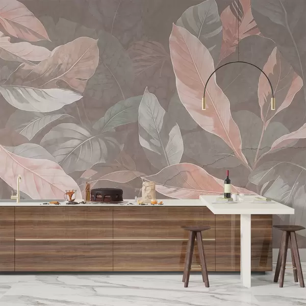Fotomurales Estampado abstracto con delicadas hojas blancas, beige y melocotón sobre un fondo de textura suave y apagada Nr. w08322v1