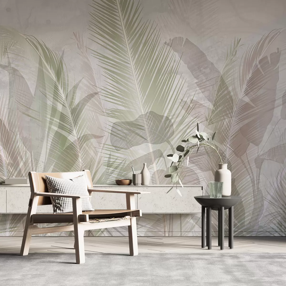Fotomurales Hojas de palmera tropical en suaves colores pastel, con un fondo de textura borrosa y nebulosa Nr. w08326