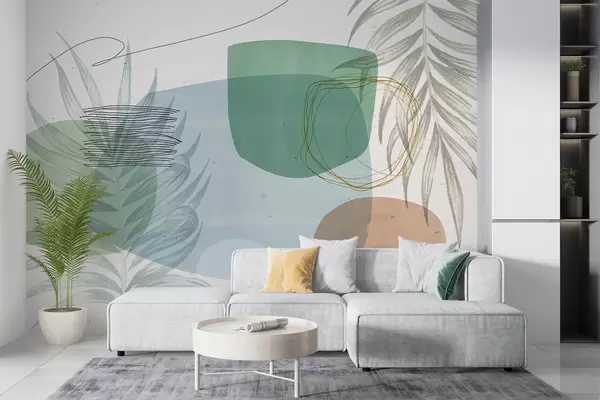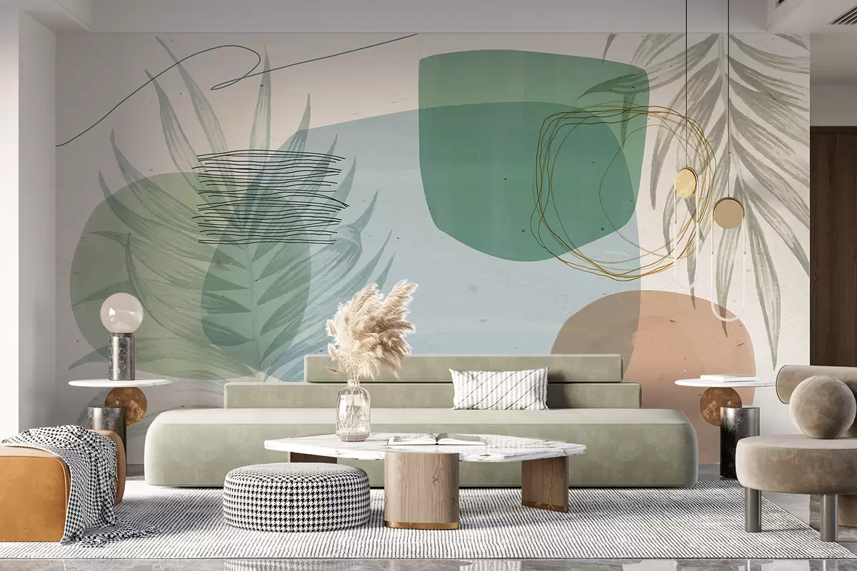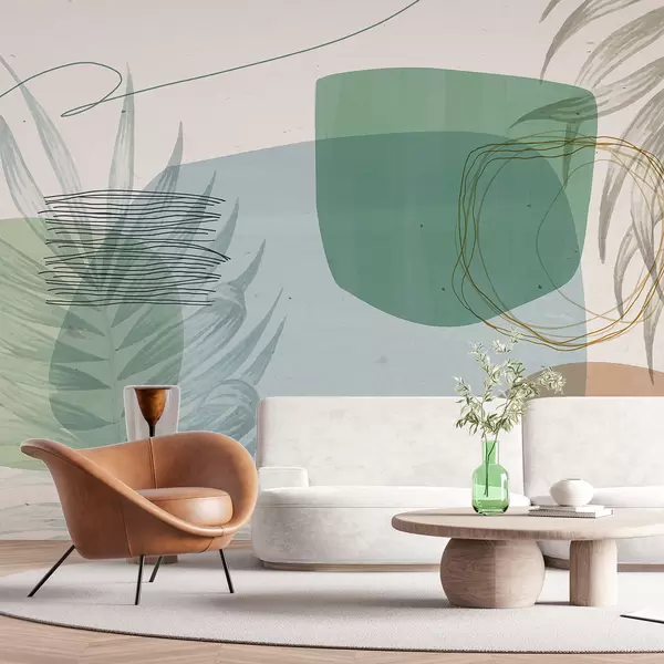 Fotomurales Composición abstracta texturizada con formas orgánicas y hojas tropicales, en colores pastel apagados Nr. w08335
