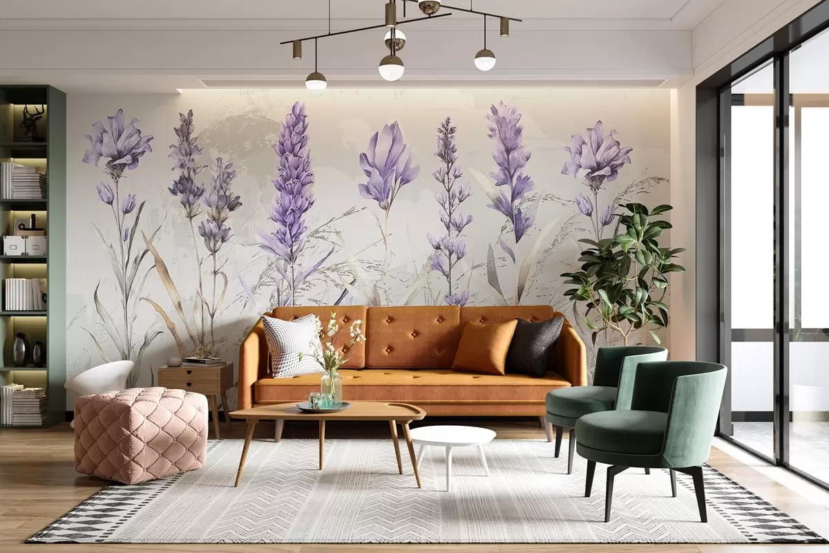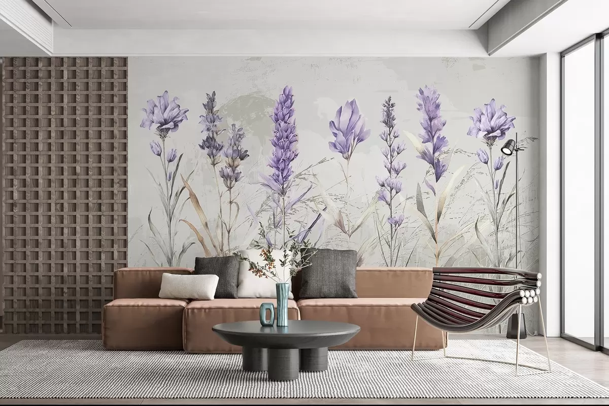 Fotomurales Un campo de flores de lavanda de acuarela púrpura con fondo beige de textura suave y borrosa Nr. w08346