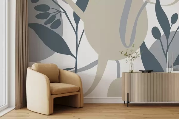 Fotomurales Un estampado floral abstracto minimalista con formas beige y grises sobre fondo blanco Nr. w08400