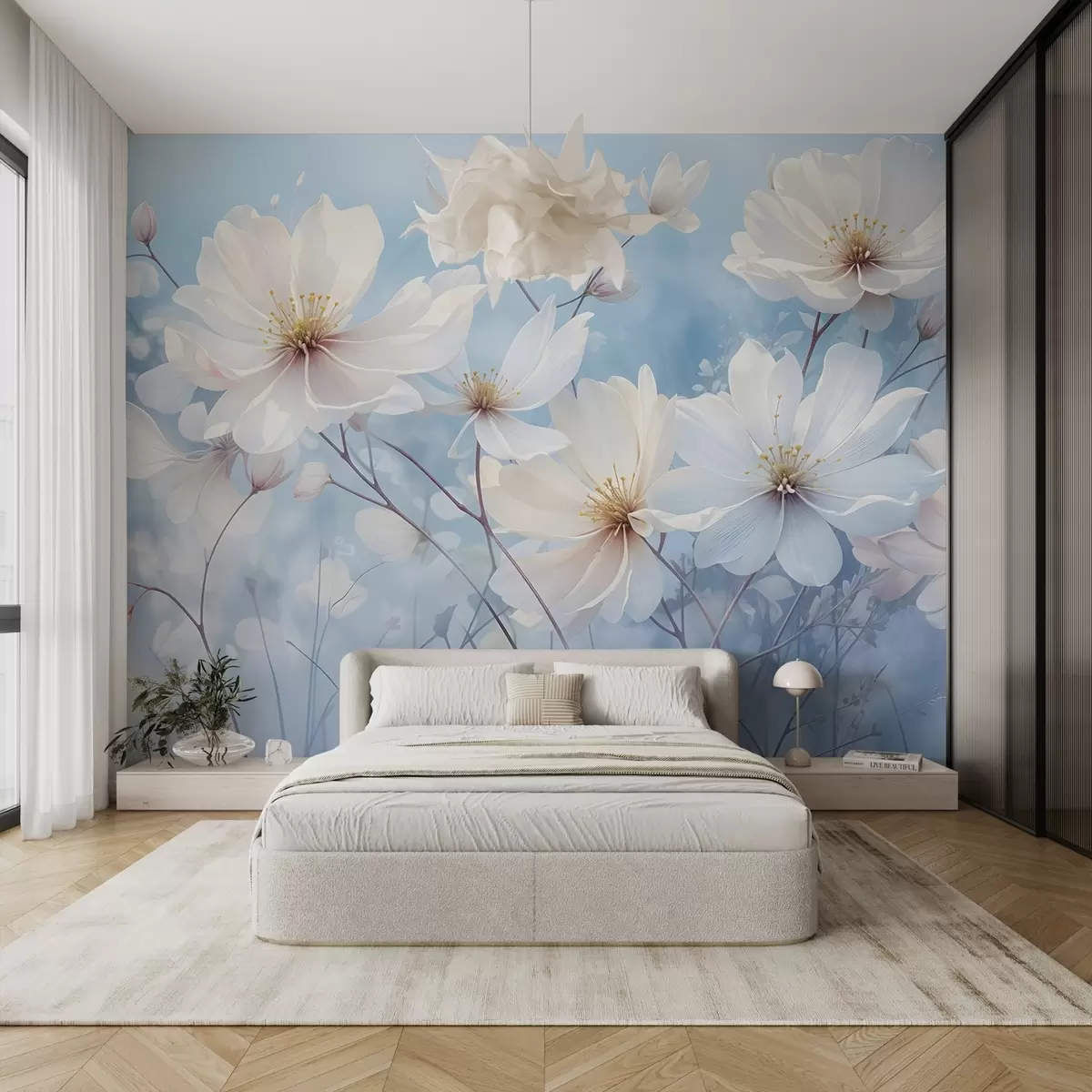 Fotomurales Delicadas flores blancas con suaves pétalos sobre un fondo azul difuminado, que crean una atmósfera serena y etérea Nr. w08412