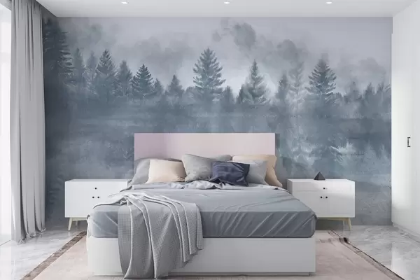 Fotomurales Un paisaje sereno con un lago helado rodeado de un denso pinar, con una atmósfera brumosa y neblinosa Nr. w08415