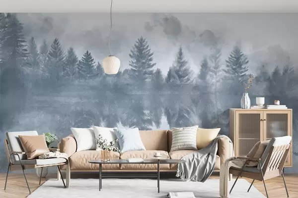 Fotomurales Un paisaje sereno con un lago helado rodeado de un denso pinar, con una atmósfera brumosa y neblinosa Nr. w08415