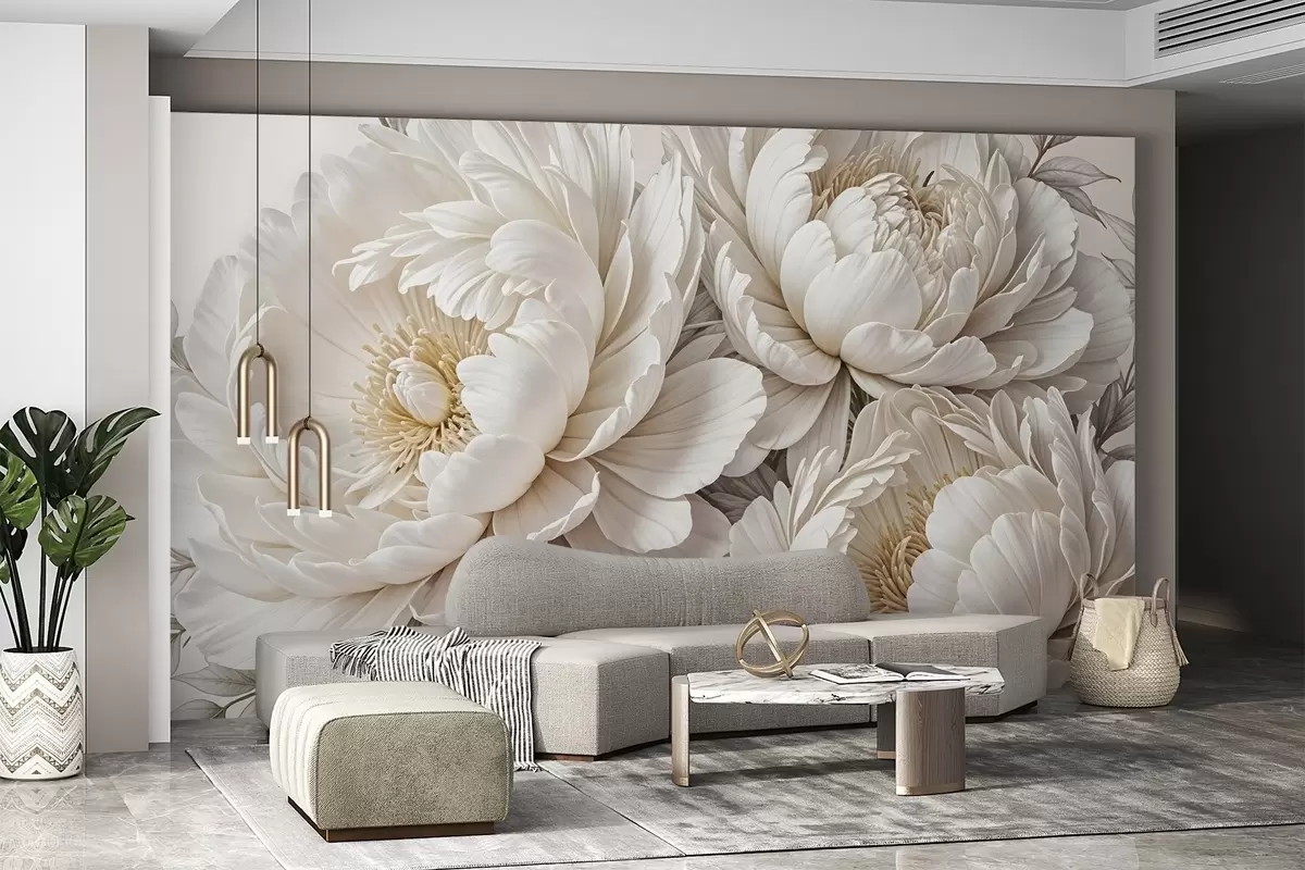 Fotomurales Delicadas peonías blancas pastel con exuberante follaje sobre un fondo suave y neutro Nr. w08420
