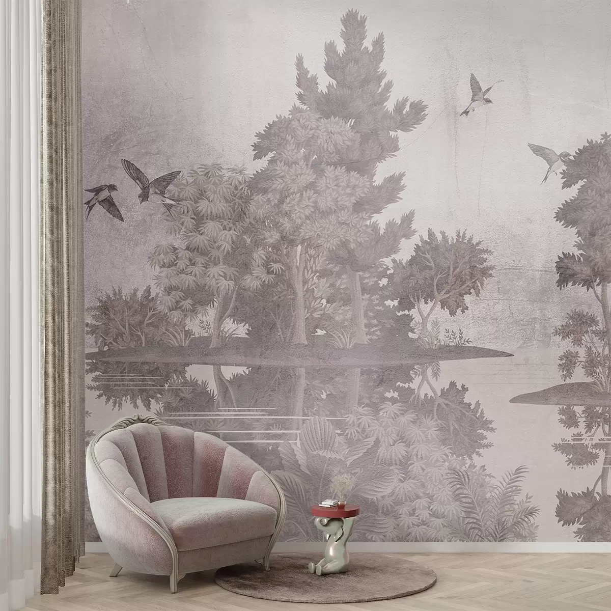Fotomurales Impresión de un paisaje forestal con un lago rodeado de pinos y otros follajes sobre un fondo beige texturizado Nr. w08426