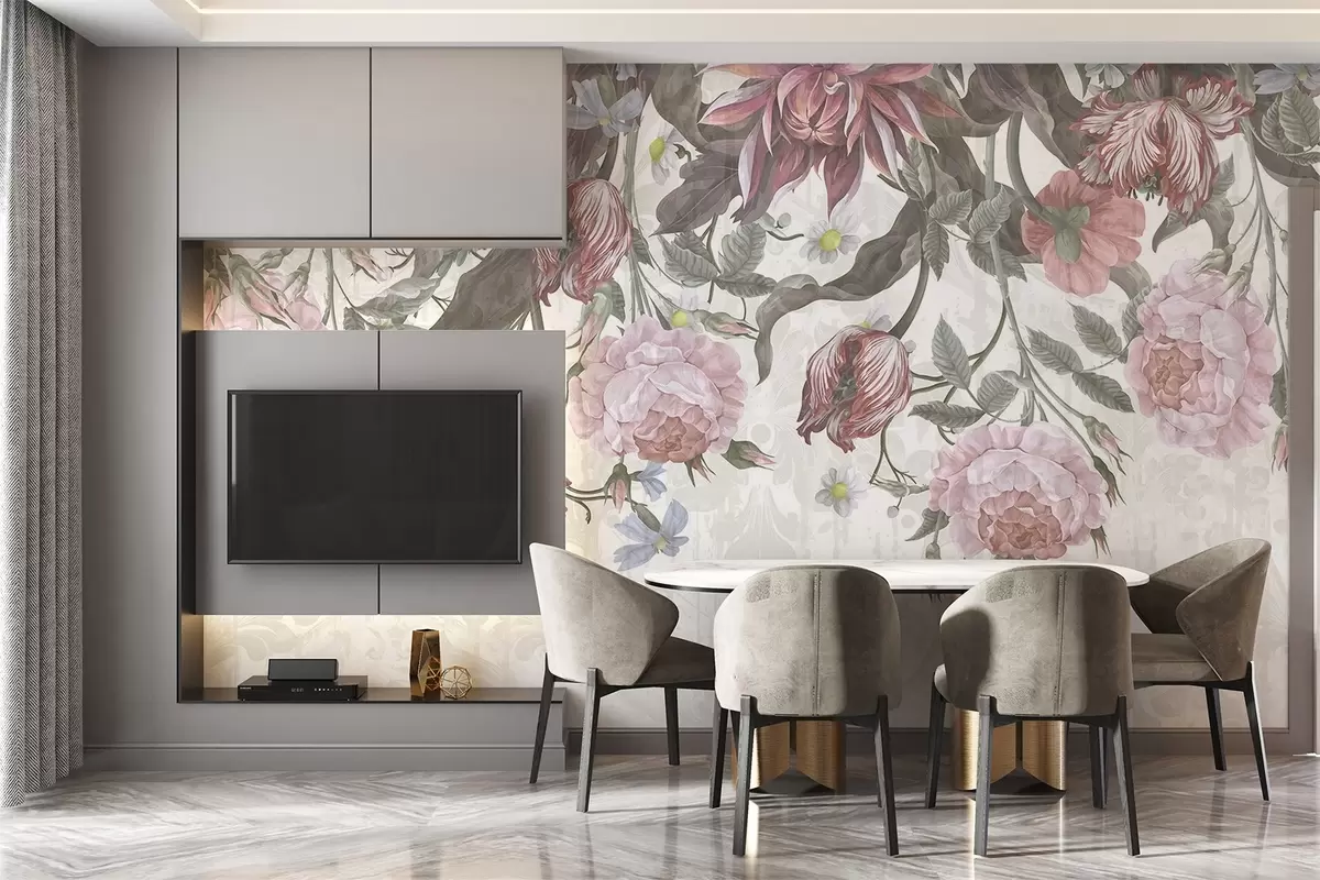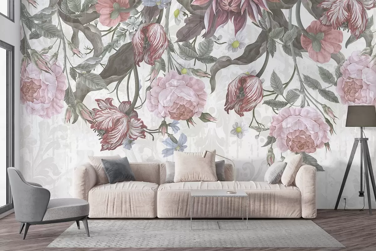 Fotomurales Un exuberante arreglo floral con grandes flores rosas y blancas, con hojas y tallos verdes Nr. w08435
