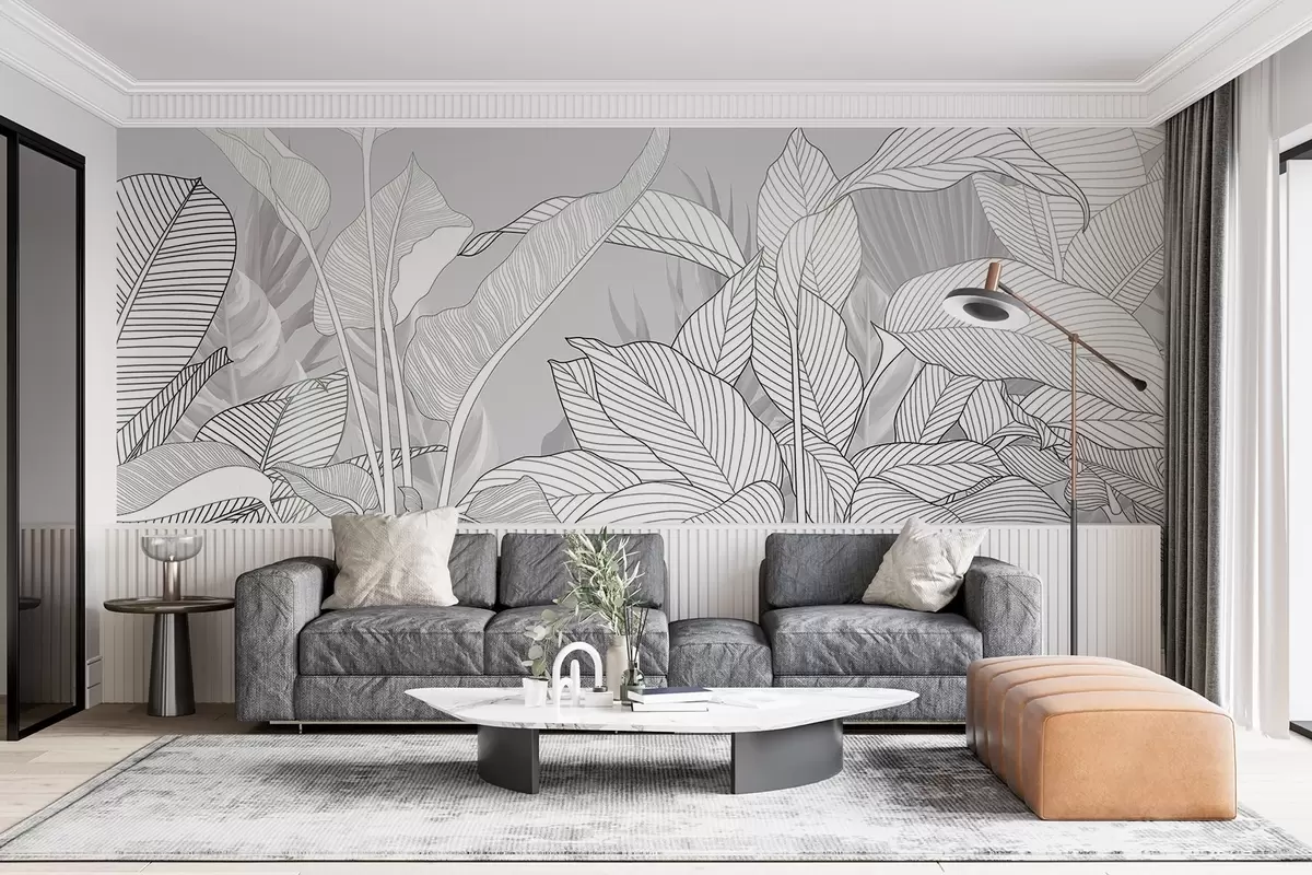 Fotomurales Ilustración monocroma de grandes hojas y follaje estilizados con intrincadas líneas y texturas Nr. w08436