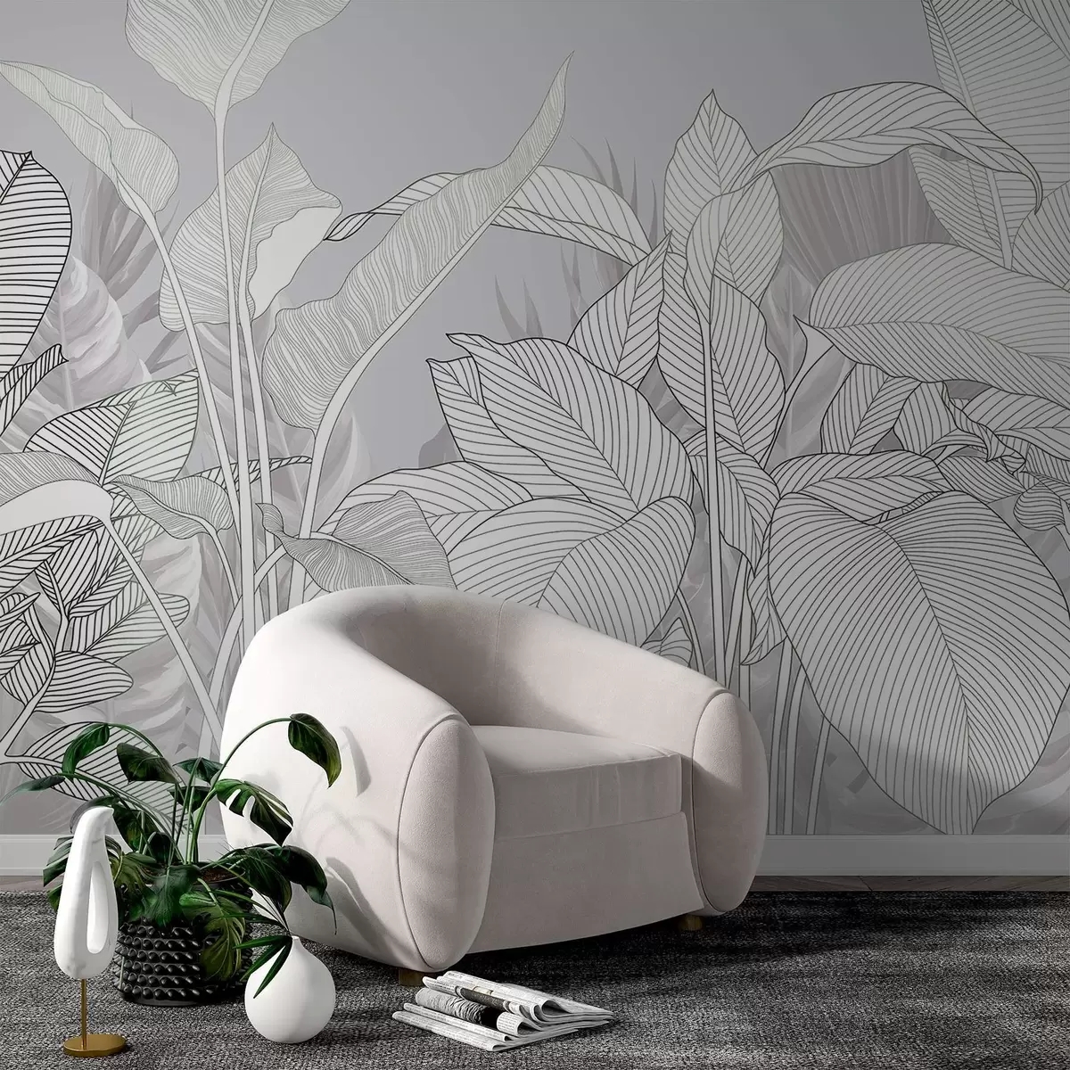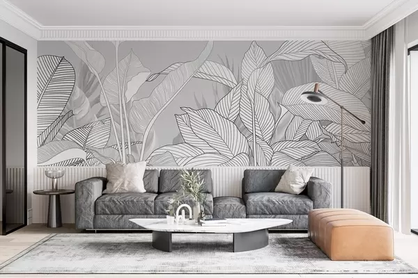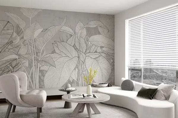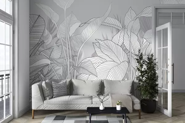 Fotomurales Ilustración monocroma de grandes hojas y follaje estilizados con intrincadas líneas y texturas Nr. w08436
