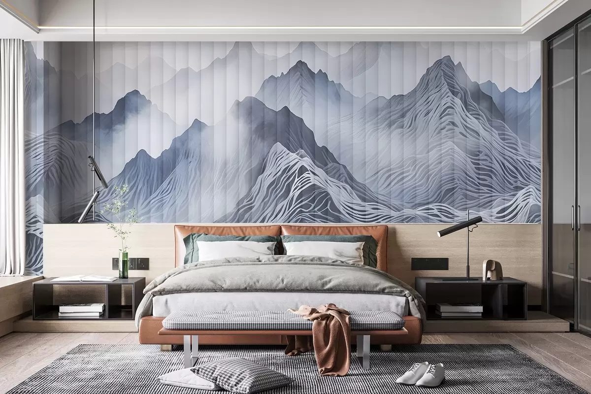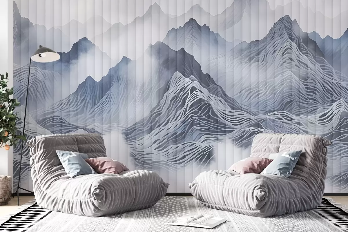 Fotomurales Paisaje montañoso abstracto y brumoso con colinas onduladas y picos en tonos grises y blancos Nr. w08440
