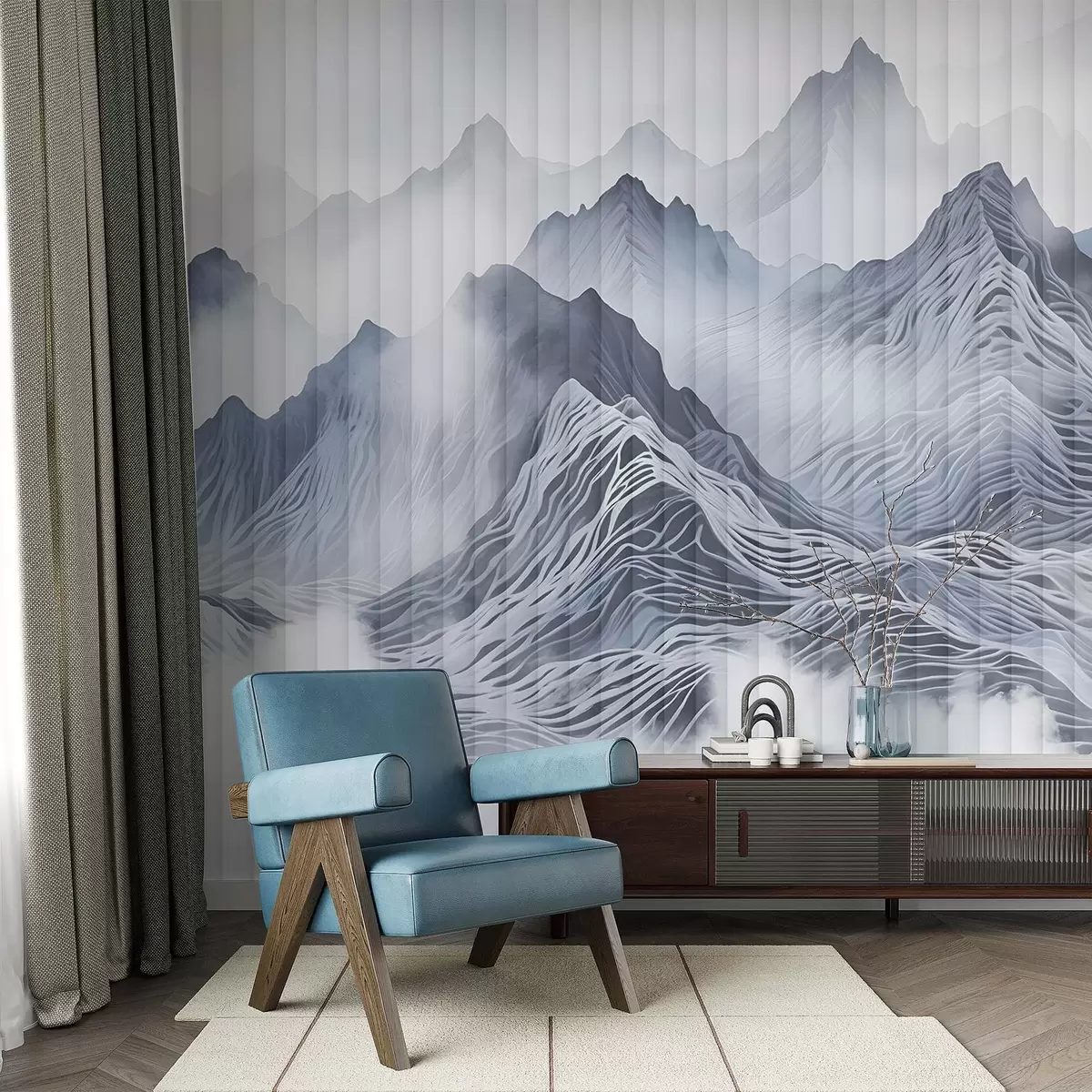 Fotomurales Paisaje montañoso abstracto y brumoso con colinas onduladas y picos en tonos grises y blancos Nr. w08440