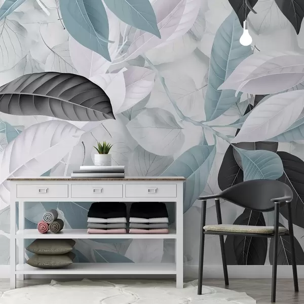 Fotomurales Gran estampado de hojas azules y grises sobre un fondo con textura de hojas claras, que crea una exuberante sensación tropical Nr. w08468v1