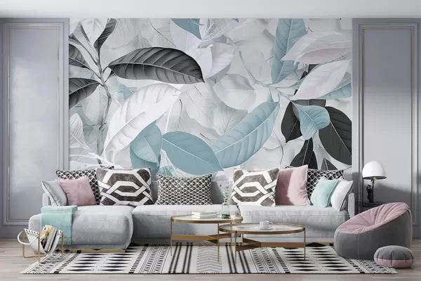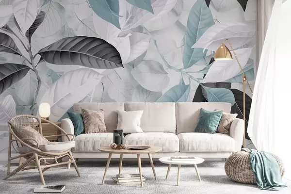 Fotomurales Gran estampado de hojas azules y grises sobre un fondo con textura de hojas claras, que crea una exuberante sensación tropical Nr. w08468v1