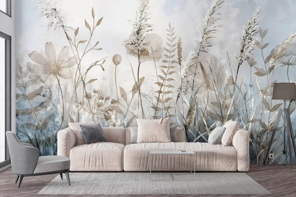 Fotomurales Un campo de hierba alta, follaje natural y plantas con texturas suaves y difusas contra un cielo nublado y brumoso Nr. w08472