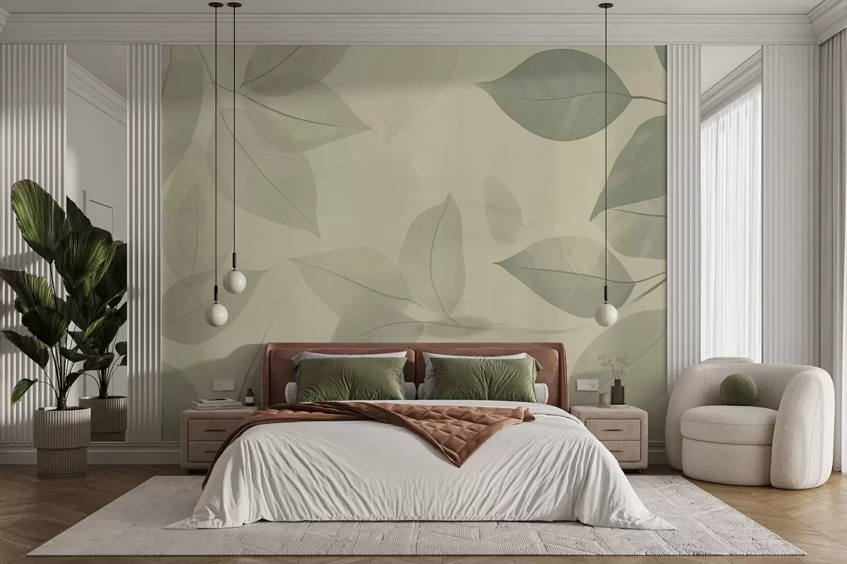 Fotomurales Ramas de hojas verdes sobre fondo beige suave Nr. w08502v2