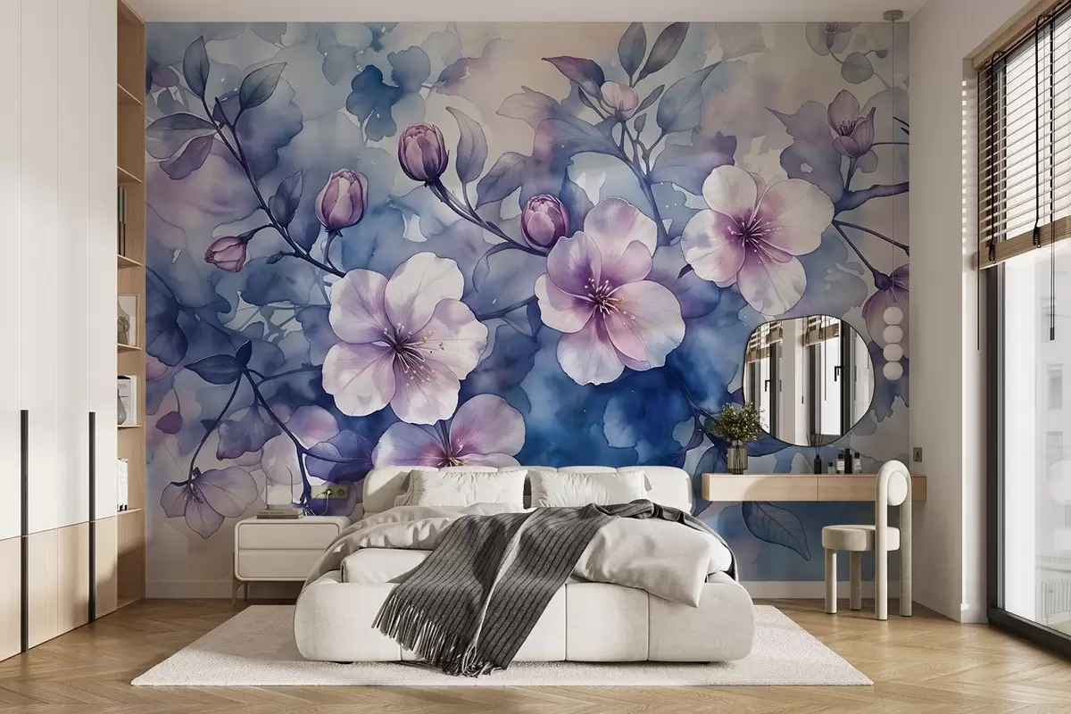 Fotomurales Delicadas flores rosas y moradas de imitación acuarela con pétalos suaves y difuminados sobre un fondo azul salpicado Nr. w08582